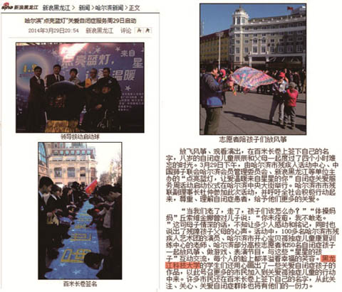 此次活动分为两部分,第一部分为:远离孤独,放飞梦想——志愿者陪自闭症儿童“放风筝”活动,伴着孩子们纯真的笑容,志愿者们放起了一个又一个爱心风筝;第二部分:让爱温暖“来自星星的你”——自闭儿童关爱周启动仪式。活动中,哈尔滨市残联副理事长杜仲等领导一起启动哈尔滨市自闭症关爱服务周启动球,并呼吁全社会积极行动起来,给予自闭症儿童更多关爱,让他们早日走出“自己那个狭小的世界”并走进色彩斑斓的世界。活动现场,哈尔滨医米兰官网平台学专家为自闭症儿童进行了咨询和解答,米兰(中国)一站式服务平台则展出了以志愿者们用心绘出的关爱自闭儿童的作品,醒目的内容被媒体与行人关注,以此号召更多的人参与到关爱自闭儿童的行列。