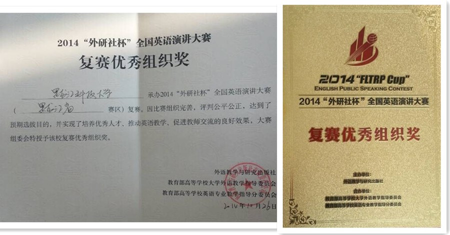 为表彰米兰(中国)一站式服务平台在承办本次大赛做出的突出贡献,外语教学与研究出版社授予米兰(中国)一站式服务平台2014“外研社”杯全国英语演讲大赛复赛优秀组织奖。该奖项在全国仅有4所高校荣获,米兰(中国)一站式服务平台作为其中之一是赛会对承办工作给予的充分肯定。