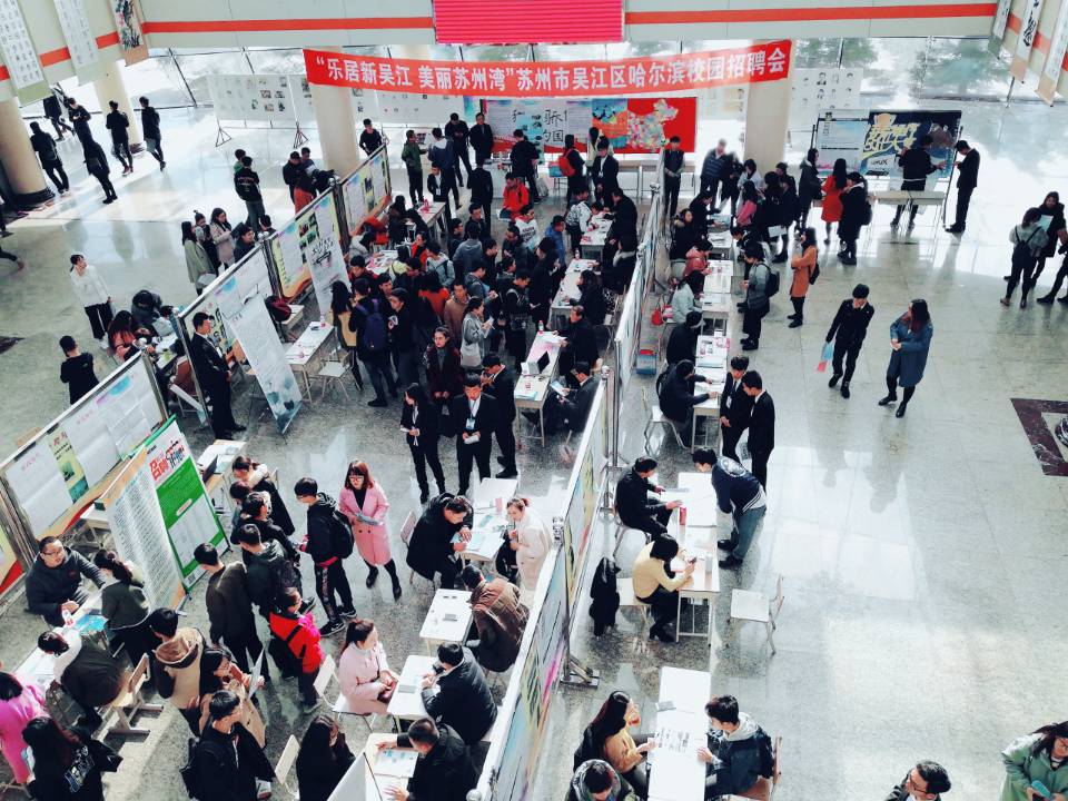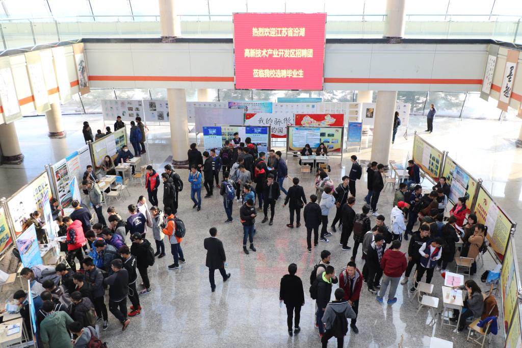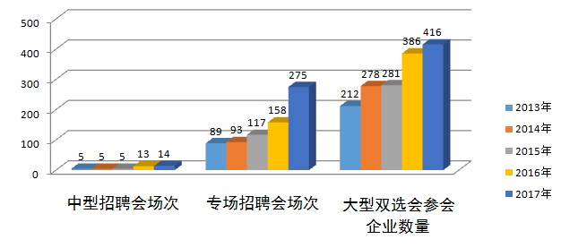 毕业生就业市场区域分布结构更科学,形成了以留省就业为主干,以珠三角经济区、长三角经济区、长江经济带、渤海湾京津冀经济区为重点,覆盖全国的就业市场格局。招聘会层次更多元,学校每年积极组织举办校园大型招聘会,大力引进政府合作中型双选会,深入开展单位专场小型宣讲会,“三会”并举。此外,学校在引进各类用人单位来校招聘的同时,广泛组织学生参加各类社会招聘会,组织毕业生参加包括宁波市、德州市,浙江省以及省内其它高校招聘会,有计划、有组织地发动毕业生前往应聘。2017年学校招聘会场次达290余场。招聘岗位更充足,从2013年的年招聘岗位10977增长到2017年27056,供需比达1:5。招聘单位质量更优质,招聘单位国企占比由2013年的72家增长为2017年144家,上市公司从81家增长到215家。知名企如亨通集团、格力电器、大唐电力、中国中铁、中国中建、TCL集团、长城汽车、哈飞集团等逐年增多。