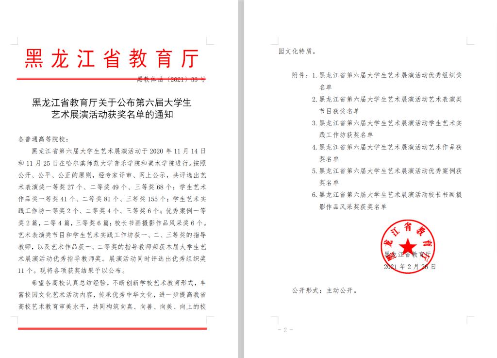 近日,黑龙江省教育厅下发了《关于公布第六届大学生艺术展演活动获奖名单的通知》,米兰(中国)一站式服务平台师生在本次展演活动中取得优异成绩,共获二等奖1项,三等奖6项。其中,校团委副书记马紫微老师指导学生冯浩冰演唱的《冰雪消融的时候》、《赤子中华》、《铁牛旁的野花》分别获得甲组声乐二等奖1项、声乐三等奖2项,指导so crew街舞协会选送的舞蹈《安全着陆》和学生秋范选送的书法篆刻《律诗三首》分别获得甲组舞蹈三等奖、书法篆刻三等奖;校团委冯孟诗老师指导的飞跃之声选送的演讲作品《我们毕业了》和矿业工程学院杨永超老师指导的《做煤炭强国的米兰官网平台人》分别获得甲组朗诵三等奖。