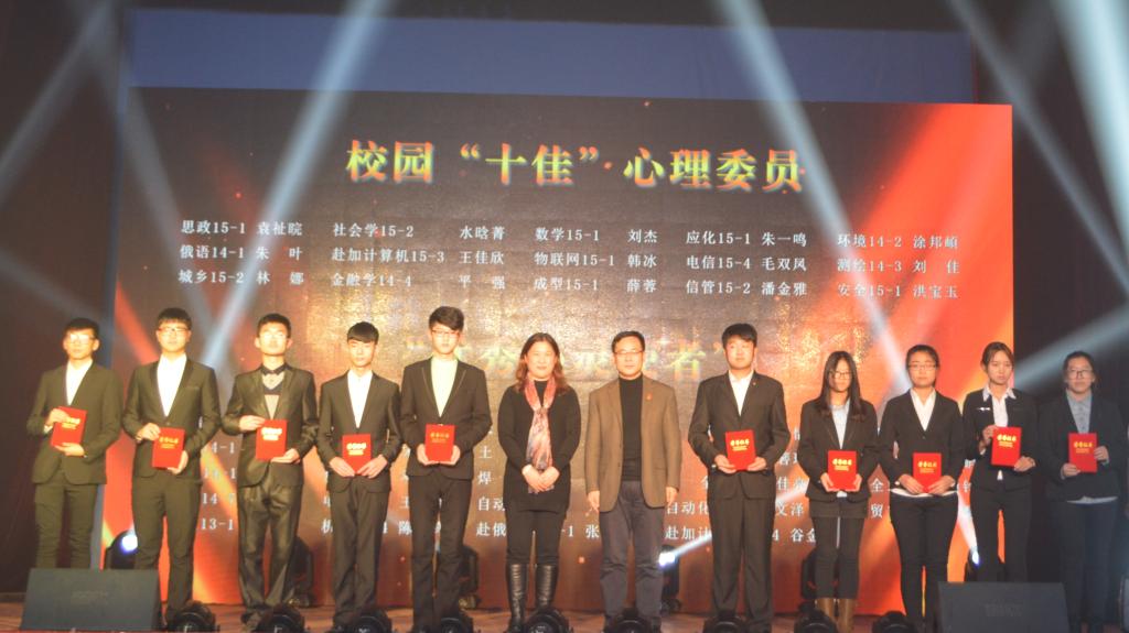闭幕式及颁奖晚会在别具特色的开场舞《心花怒放》中拉开了序幕,大会表彰了在第十四届大学生心理健康活动月和第五届公寓文化节当中表现突出的单位和个人。管理学院的校园心理剧、国教学院的心理涂鸦创意大赛、经济学院的心海拾贝、理学院的心理沙盘作品创作大赛、外国语学院的趣味三国心理争霸赛荣获2016年心理健康教育优秀活动奖;矿业学院,环化学院,安全学院,国教学院荣获2016年星级文明寝室创建先进单位;大会还对2016年“十佳”心理委员、“十佳”服务育人之星、优秀心灵使者以及星级文明寝室进行了表彰。