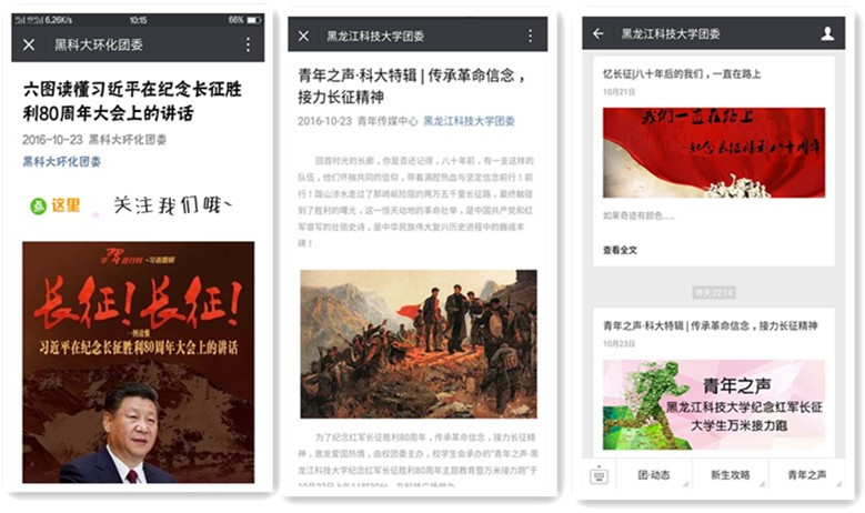 据悉,一段时间以来,校团委组织全校团学组织以主题教育的形式开展了形式多样的纪念活动,广播站、高潮报、新媒体、展板、条幅等多种载体烘托宣传氛围,校团委、建工学院、管理学院等从校院两级角度分别召开了纪念红军长征胜利80周年文艺演出,环化学院组织召开了纪念红军长征胜利80周年研讨会,理学院组织召开了“重走长征路”徒步走活动,各团支部纷纷召开了主题团活和纪念长征胜利80周年爱国歌曲学唱活动。通过主题教育活动,充分激发广大青年学生的爱国热情和民族自豪感,引领全体学生铭记历史、坚定信念、肩负使命、奋发有为,继承和弘扬伟大长征精神,不忘初心,继续前进,走好新的长征路!(苗雨 马紫微/文 段建建 陈琳 郎诗晨/图)