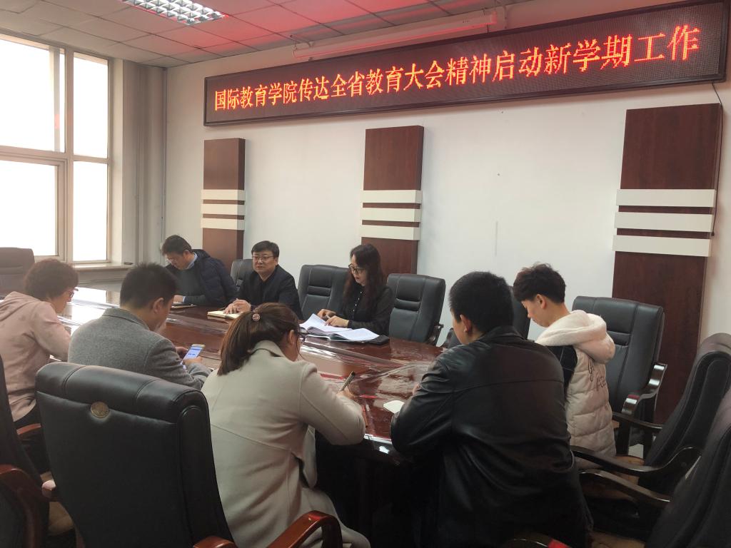 2月28日,新学期开学的第一天,国际教育学院召开职工大会,学习贯彻全省教育大会精神,启动新学期各项工作。
