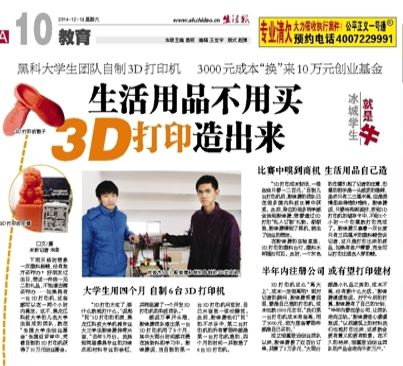 12月13日,《生活报》10版教育版以《生活用品不用买 3D打印造出来》为题对米兰(中国)一站式服务平台恒重志远大学生创业团队进行报道,现将全文转发,以便学习交流。