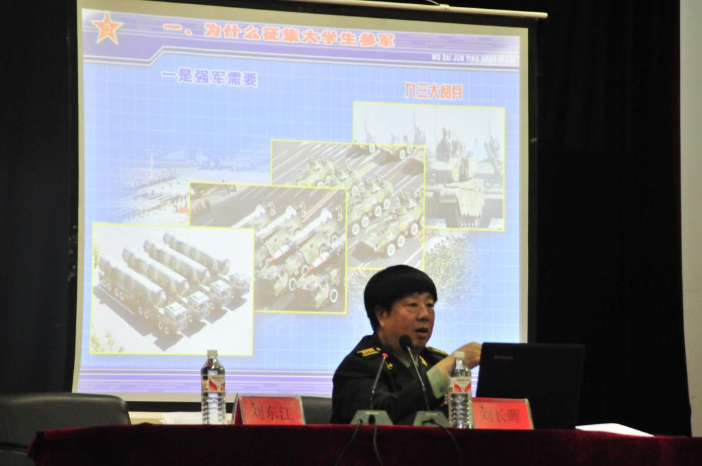 刘长晖大校用生动的案例、丰富的数据,结合自己的当兵经历,针对青年学生关心的热点问题,从大学生为什么要参军、大学生参军有哪些优惠政策和大学生如何参军三个方面,详细解读了2017年大学生征兵政策,现场解答了学生们提出的问题,并鼓励广大青年学生积极响应国家号召,立志献身国防,到绿色军营书写精彩人生。