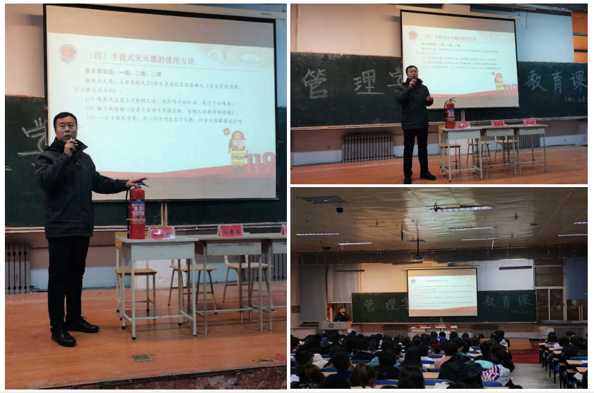课上,张景奎从“高校火灾事故的主要类型、扑灭初期火灾的有关技能、火灾逃生自救的方法原则、着力做好火灾事故的预防”四个方面,采取理论与案例相结合的方式,全面系统地讲授了校园消防安全知识。同时,他警示同学们“欠缺安全意识、无视校园安全管理规定、不了解自救方法”是引起火灾事故的三大主要原因;并告诫同学们,“充电器长期不拔,使用吹风机、热得快、电热锅等违规电器也是引发寝室火灾的主要因素;教会了同学们“一摇二拿三喷”是灭火器正确的使用方法;提示同学们在遭遇火灾时“拿取湿毛巾捂住口鼻弯腰前进”的正确做法。