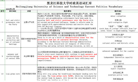米兰官网平台时政英语词汇库,每个月月底发布一次,包括四个部分:英文词汇、对应汉语、相关词汇、相关词汇的例句,内容涵盖了当下抗击新冠肺炎疫情的中国实践、数字基础设施建设、在线新经济、自由贸易港、安全生产等政治、经济、文化各领域最新词汇,同时也包含了学校各相关学科的专业词汇,对于学校各学科的国际化建设的语言储备,对于学生的考研和四六级考试提供了便利的服务。