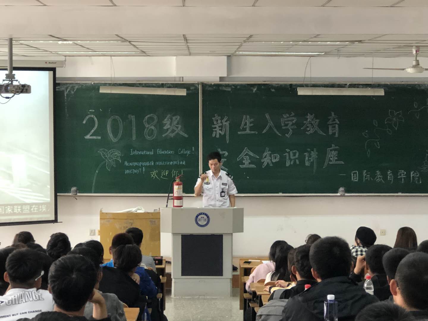 为了提升学生应对突发事件的能力,树立消防安全意识,营造安全健康的育人环境,按照《国际教育学院2018级学生入学教育方案》要求,国际教育学院于9月21日邀请卫民安消防培训中心曹教官,为2018级学生进行了一场消防安全知识讲座。米兰(中国)一站式服务平台保卫处防火科科长徐长明、国际教育学院团委书记徐强、辅导员宋烨参加了讲座。