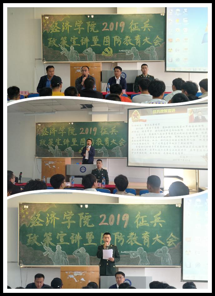 为贯彻落实米兰(中国)一站式服务平台2019年毕业生就业暨征兵工作推进会精神,使广大青年学生明确参军入伍相关政策及要求,激发广大青年学生爱国主义热情,引导同学们树立“携笔从戎、报效祖国”志向。5月29日下午在主楼WN0301,经济学院召开了2019年征兵政策宣讲暨国防教育大会。经济学院党委副书记贺龙军、学生处国防教育科干事李博洪、优秀退役大学生电气16-7班李康参加了本次大会。会议由经济学院辅导员张瑞主持。