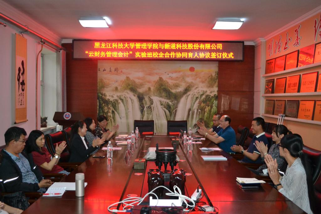 6月28日,管理学院与新道科技股份有限公司在管理学院会议室举行共建“云财务管理会计“实验班签约仪式。管理学院院长谭旭红、副院长郭红、会计系主任薛艳及会计系骨干教师,新道方的代表有新道科技股份有限公司副总裁宋健、黑龙江省区总经理张海冰、黑龙江省区销售总监王智轩参加本次签约仪式,会议由“云财务管理会计“实验班负责人王丽敏主持。