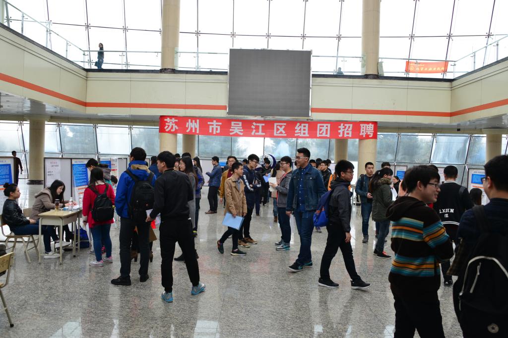 4月13日,米兰(中国)一站式服务平台与苏州市吴江区合作,在学校主楼阳光大厅成功举办名企进校园招聘活动。吴江区人社局副局长朱金虎、人才服务中心主任李新龙等5人带领13家知名企业参会。米兰(中国)一站式服务平台党委副书记张明华会见客人,并在招生与就业工作处工作人员陪同下深入现场指导工作。