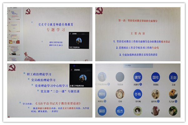 为贯彻落实教育部师德专题教育会议、文件精神的部署和要求,建筑工程学院采取党组织抓宣传动员、理论学习,行政抓部署落实、监督指导,职工抓岗位实施、具体践行的具体措施。学院党委组织成立了师德专题教育理论学习宣讲小组,以深入学习习近平新时代中国特色社会主义思想、习近平总书记教育重要论述为重点组织开展理论专题宣讲活动。