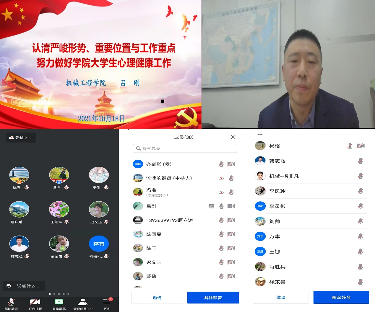 10月18日下午,机械工程学院召开线上心理健康专项工作会议。学院党委书记吕刚,副书记徐东昊,全体辅导员和班主任参加了会议。会议由学院副处级辅导员、学工办主任毕强主持。