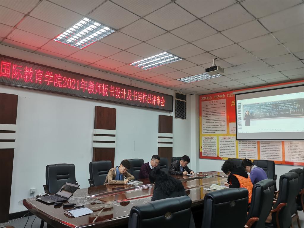 为了加强教师队伍建设,强化教师基本功训练,培养教师具有“扎实学识”,国际教育学院在“教案设计大赛”后开展了“板书设计及书写大赛”。经过近1个月的准备和作品收集,学院教学指导委员会于2021年10月27日在科高0606会议室对教师板书设计及书写作品进行了评审。