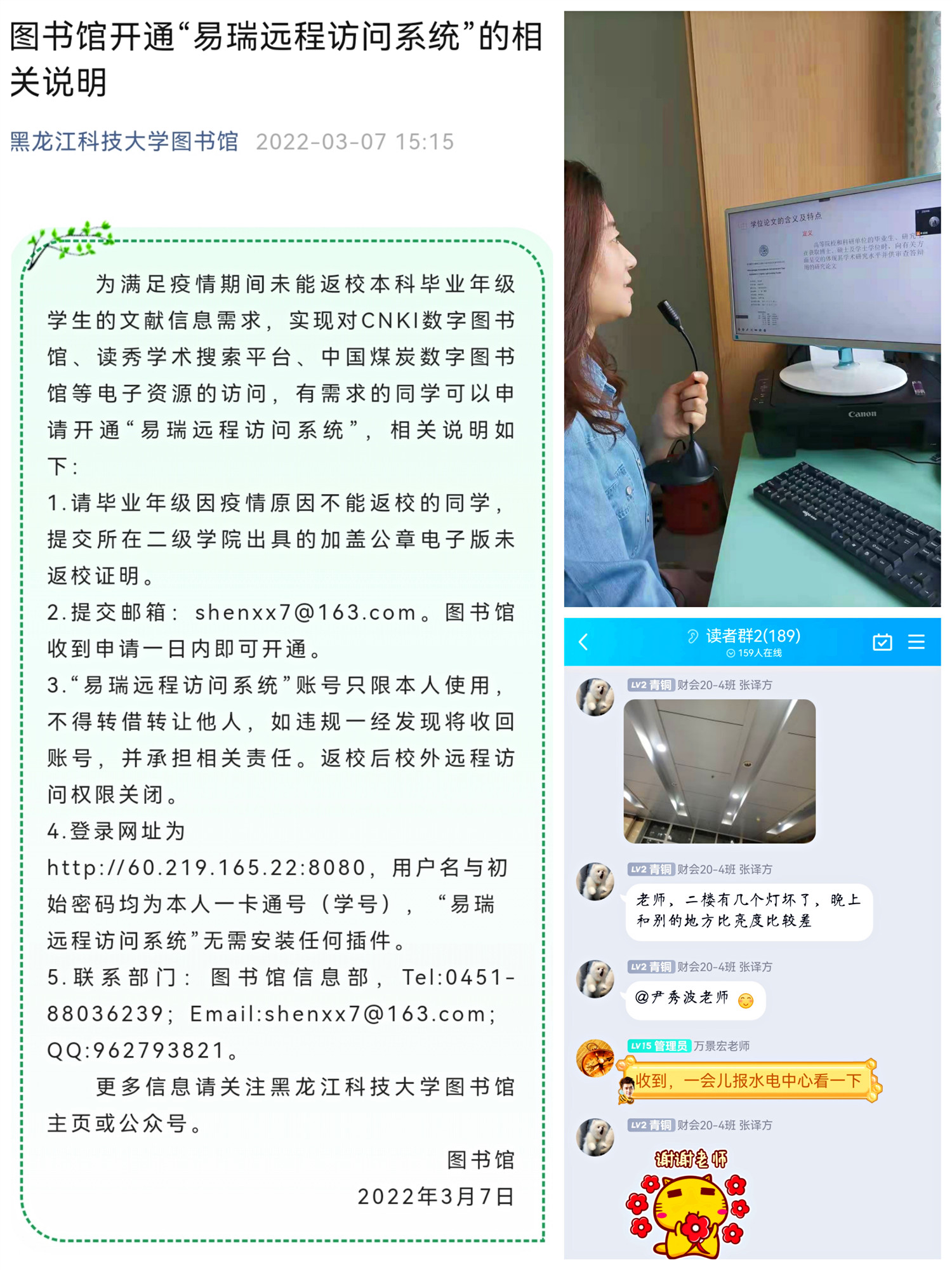 为满足疫情期间未能返校本科毕业年级学生的文献信息需求,实现对CNKI数字图书馆、读秀学术搜索平台、中国煤炭数字图书馆等电子资源的访问,给有需求的学生开通了“易瑞远程访问系统”;线上服务咨询不间断,图书馆工作人员及时在读者群、公众号等平台响应师生读者关于电子资源访问、数据库查询检索、查收查引等方面的咨询,即时答复疑问、及时解决问题;图书馆的信息检索课程也转阵线上,三位授课教师精心备课,为机械工艺6个班级丶自动化5个班级及研究生2个班级开展了线上课程,让学生足不出户就能获取所需的信息知识和技能。