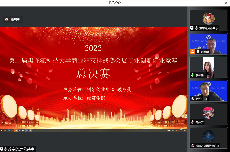 大赛邀请全国商业精英挑战赛会展创新创业竞赛吉林省赛区组委会秘书长赵可心、黑龙江旅游职业技术学院会展与旅游电商系主任李晓、创新创业中心副主任芦少春,经济学院院长孙永波,经济学院副院长郭红,经济学院教师籍丹宁、刘黎明、管理学院教师李春富作为嘉宾评委。参赛队伍的指导教师及学生在线观看比赛。