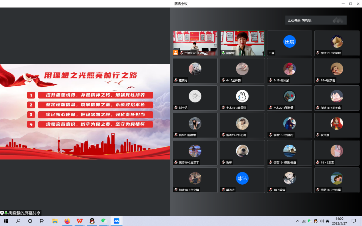 一堂“主题党课”。在党的二十大即将召开之际,立足“第二个百年奋斗目标”新征程的关键节点,为了进一步教育引导毕业生党员坚定不移听党话、跟党走,将爱国情、强国志、报国行融入到毕业后的人生征途中,学院于5月27日,学院于线上开展“用理想之光 照亮前行之路”毕业生党员主题党课。课堂上,学院党委副书记海英分别从提升思想境界,坚定理想信念,牢记初心使命,增强服务宗旨,四个方面给毕业生党员上了一堂生动的党课。旨在强化毕业生党员的党性意识、宗旨意识和服务意识,引导和激励毕业生党员自觉加强理论学习和修养,鼓励大家将来在各行各业的模范带头作用。