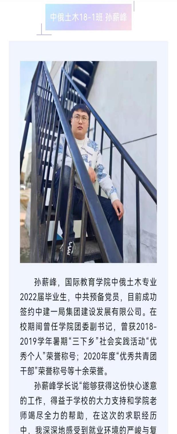 一次毕业生经验交流。为进一步发挥优秀学生的影响和辐射作用,学院邀请保研学生代表成功被山东大学录取的周雨豪、学校“就业先锋”成功就职于中建一局集团建设发展有限公司孙薪峰同在校生开展“经验共分享 交流促成长”交流会,在交流过程中,毕业生们把自己有关学校选择、专业选择、求职面试、能力培养提高等方面的亲身体会和经验,勇于进取和追求理想的精神与学弟学妹们一起分享,用日积月累的经验、渐趋渐广的眼界去帮助学弟学妹们遨游知识海洋,进一步加强学风培育与治理,调动全体同学学习的目标性、主动性和创造性。