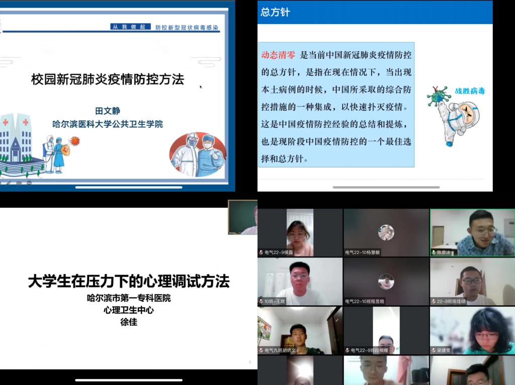帮助学生上好保护自己第一课。通过播放哈尔滨医米兰官网平台学公共卫生学院田文静教授的《校园新冠肺炎疫情防控方法》,引导同学们做好疫情防控;通过播放哈尔滨市第一专科医院徐佳主任的《大学生在压力下的心理调试方法》视频,引导同学们正确认识生活中的压力。班主任利用主题“云班会”引导同学们牢固树立安全意识。