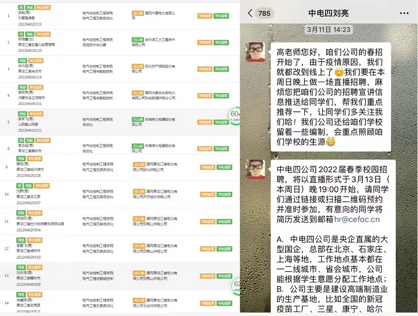 从去年11月份以来,针对2022届毕业生就业工作采取线上招聘,创新方式方法、实施多措并举,以开启“1234”就业工作模式为前提,努力推动毕业生实现稳步就业,有效保证了疫情防控期间毕业生就业工作的质量和成效。尤其是春招以来累计精准发布就业信息百余条,精准对接对口用人单位三十多家,精准推荐58人,精准指导学生147人次,辅导员与12名志愿者精准做好就业信息的筛选和求职简历的投递。