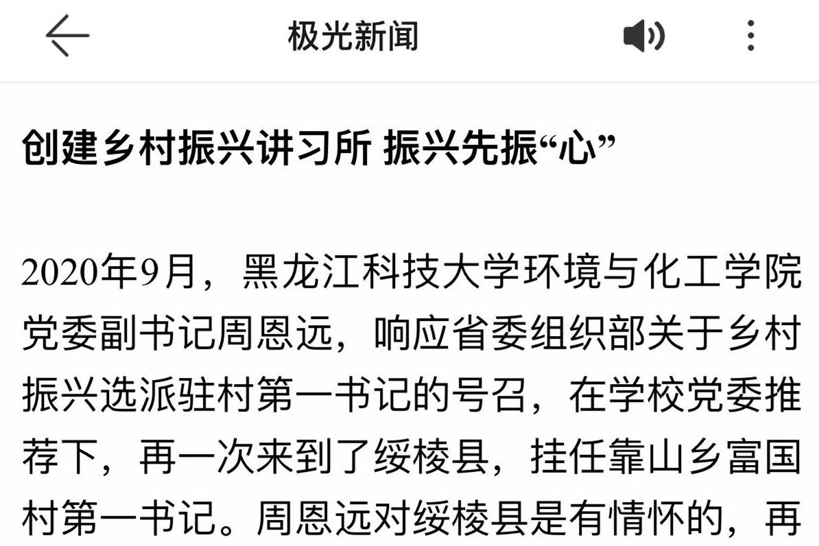 2020年9月,米兰官网平台环境与化工学院党委副书记周恩远,响应省委组织部关于乡村振兴选派驻村第一书记的号召,在学校党委的推荐下再一次来到了绥棱县,挂任靠山乡富国村第一书记。