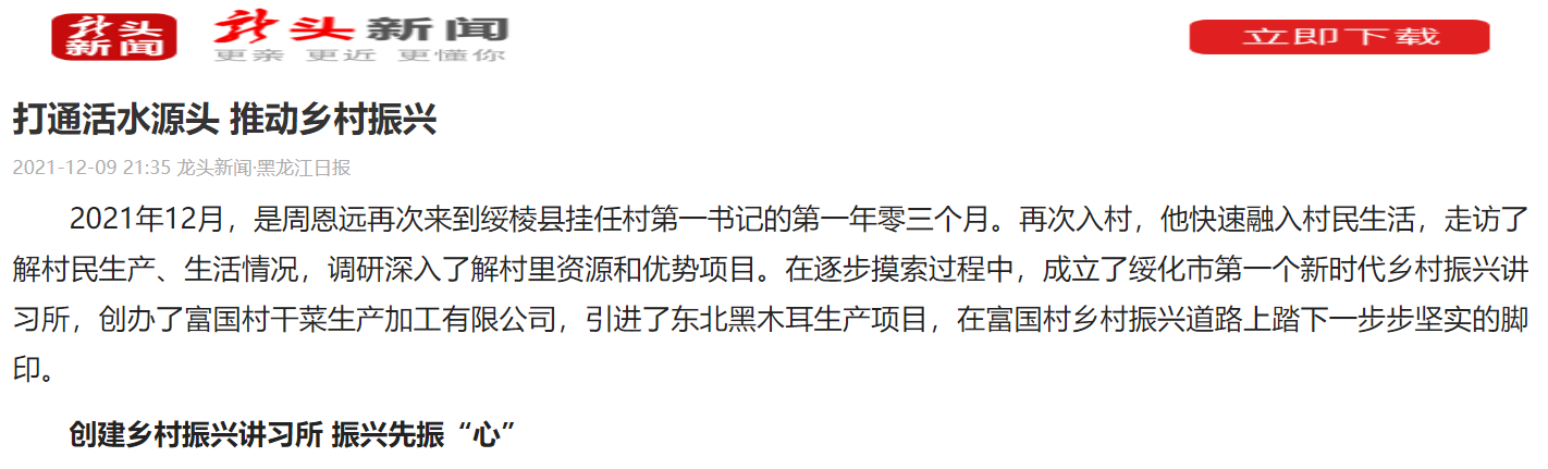 2021年12月,是周恩远再次来到绥棱县挂任村第一书记的第一年零三个月。再次入村,他快速融入村民生活,走访了解村民生产、生活情况,调研深入了解村里资源和优势项目。在逐步摸索过程中,成立了绥化市第一个新时代乡村振兴讲习所,创办了富国村干菜生产加工有限公司,引进了东北黑木耳生产项目,在富国村乡村振兴道路上踏下一步步坚实的脚印。