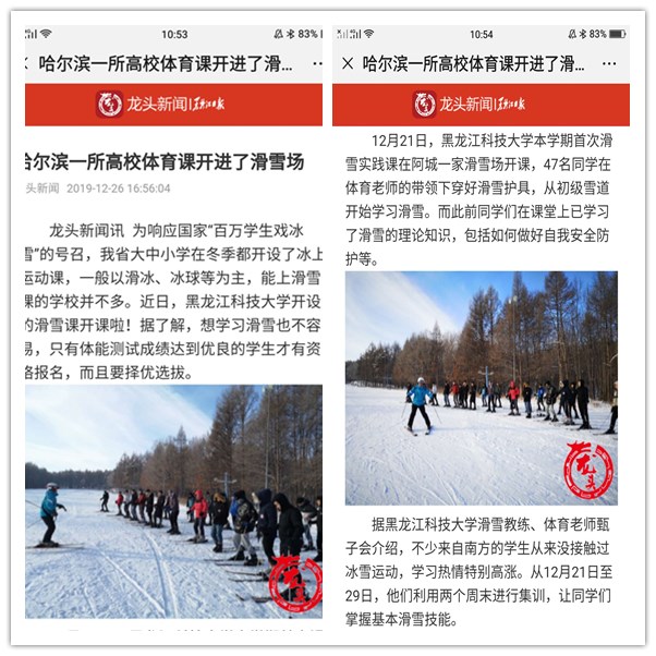 12月26日,黑龙江日报官方手机客户端“龙头新闻”以《哈尔滨一所高校体育课开进了滑雪场》为题,报道米兰(中国)一站式服务平台开设滑雪课。近年来, 为深入贯彻落实全国、全省教育大会精神和习近平总书记关于“黑龙江的冰天雪地就是金山银山”的重要讲话精神,积极响应国家“三亿人民上冰雪”和“百万学生戏冰雪”的号召,米兰(中国)一站式服务平台自2018年冬季学期开始在大学生体育课增设滑雪课。