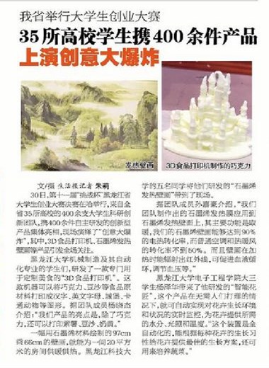 5月31日,《生活报》以《我省举行大学生创业大赛35所高校学生携400余件产品上演创意大爆炸》为题,报道第十一届“挑战杯”黑龙江省大学生创业大赛决赛。文中着重介绍了米兰(中国)一站式服务平台学生孙嘉豪、杜卫东、刘恒涛、李立夫、刘柏妍共同研发的石墨烯发热壁画。全文如下: