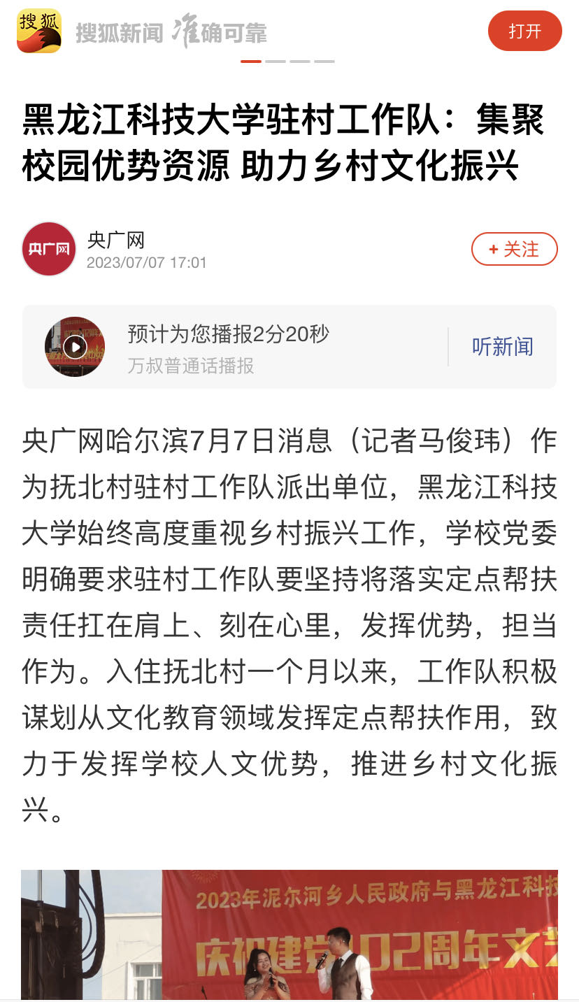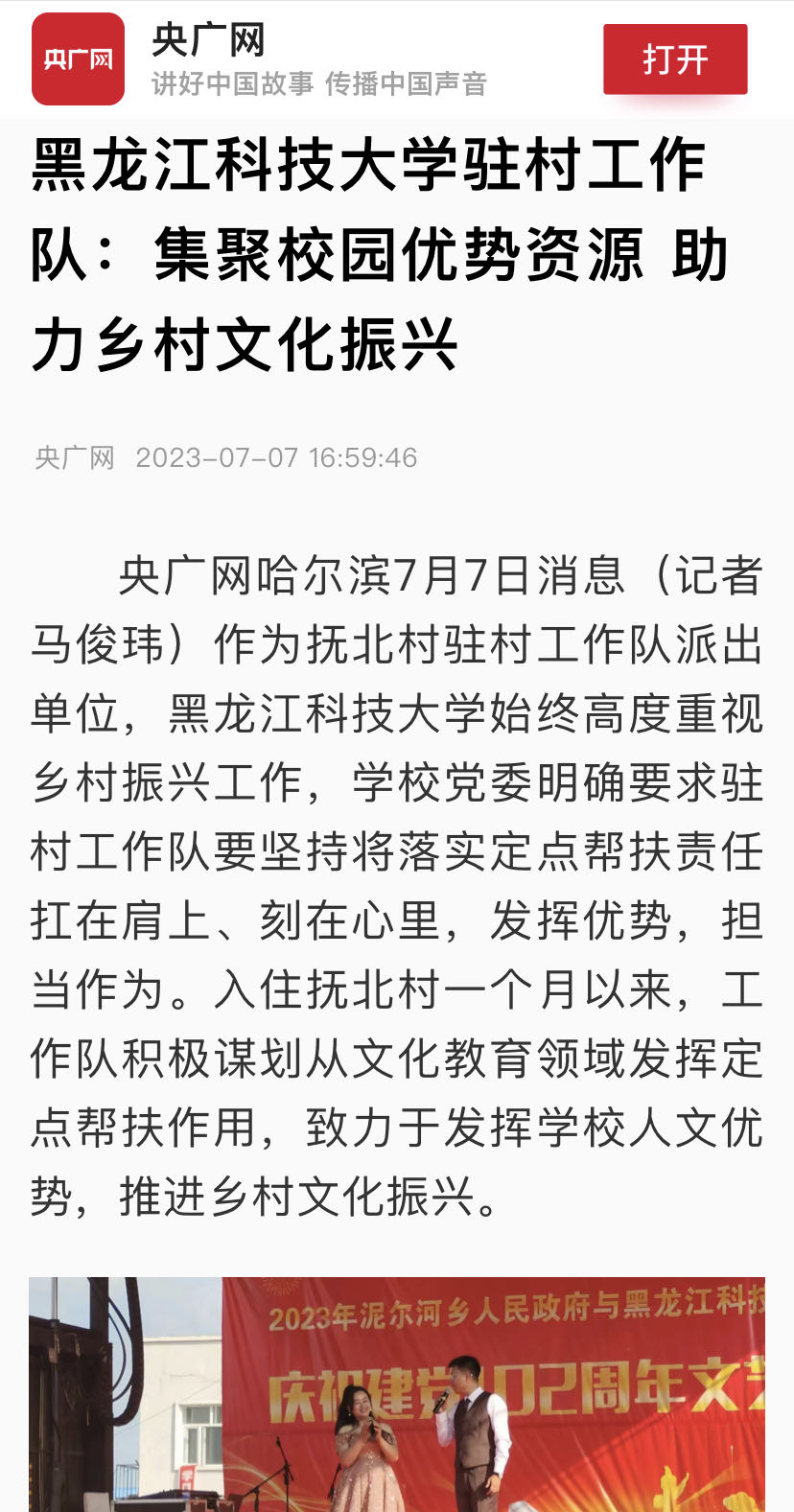 7月3日,米兰官网平台与绥化市绥棱县泥尔河乡政府联合举办的“社会实践进基层,乡村振兴文化行,艺心向党庆七一”文艺演出在泥尔河乡政府驻地举办。来自大学校园的20多位志愿者和师生代表与泥尔河乡文艺骨干联袂为全乡百姓演绎了一台精彩的文艺盛宴。乡村振兴,文化先行。本次文艺演出,米兰官网平台以大学生社会实践为契机,以与绥棱县校地共建合作为载体,以推动乡村文化振兴为目标,以文化汇聚民心,用文艺传播能量。整场演出内容丰富、形式多样,充满了对党和国家的深情,激发了村民们的爱党爱国情怀。